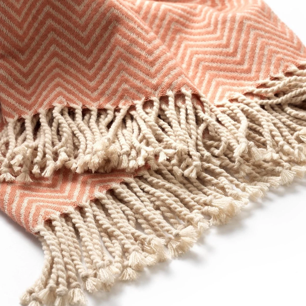 Luxe woonkleed met zigzag patroon en vrolijke flosjes. Plaid Evony heeft een afmeting van 140×180 cm. De warme stof met de kleuren Muted Clay en beige is heerlijk zacht en is makkelijk te combineren.