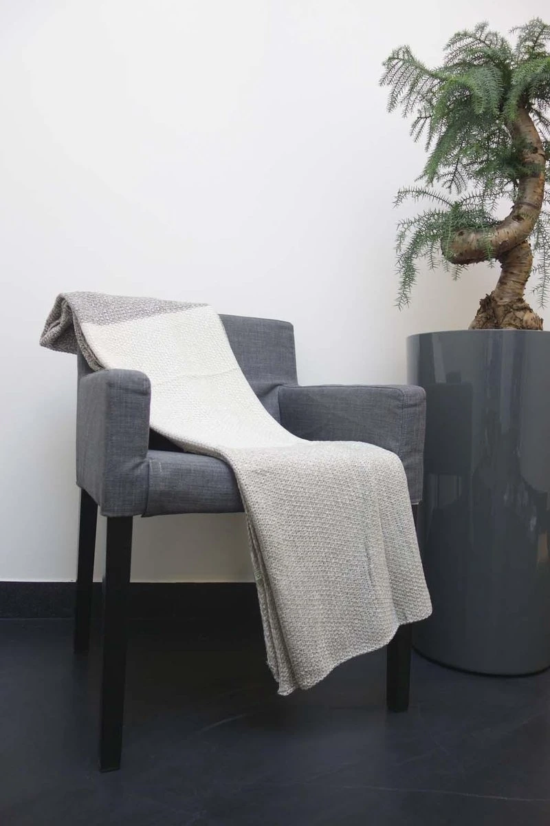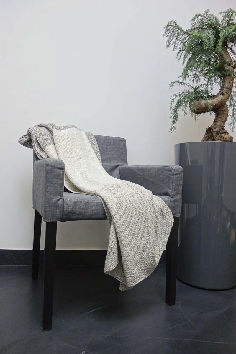 De gebreide textuur geeft het een verwelkomend, huiselijk gevoel, maar wel modern. De plaid is gemaakt van acryl en heeft een afmeting van 130 bij 180 centimeter.