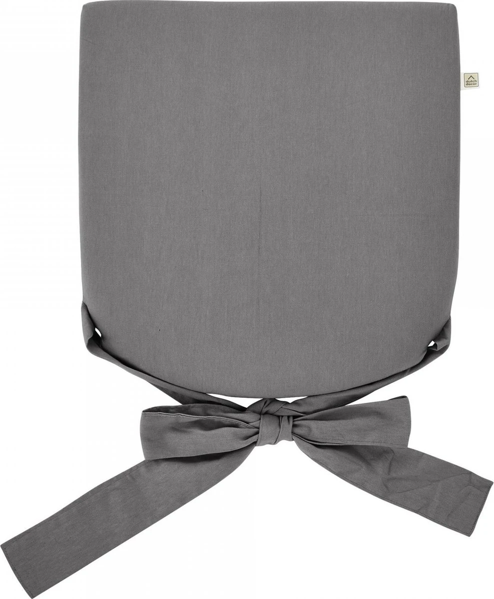 Dutch Decor Stoelkussen Java is vervaardigd van 100% katoen. De kleur Charcoal Gray is makkelijk te combineren. De binnenvulling is gemaakt van polyester en gemakkelijk uit de hoes te halen zodat de gewassen kan worden (handwas). Het stoelkussen heeft twee linten voor bevestiging aan stoel of muur. De twee linten zijn 94 cm lang.