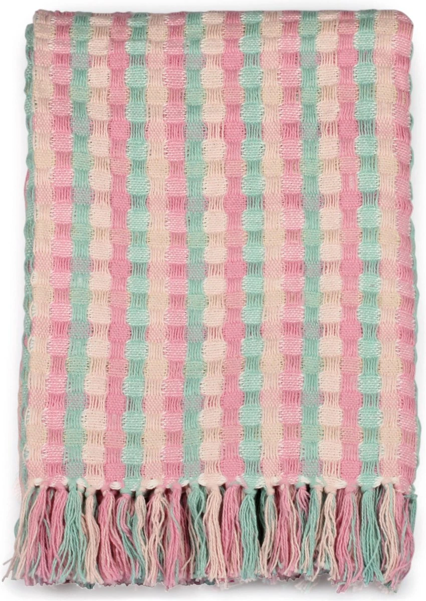 Een plaid van 100% katoen in de kleur porcelein. Een behaaglijk plaid voorzien van een gehaakt patroon aan weerszijden in fraaie kleuren in een afmeting van 130×180.