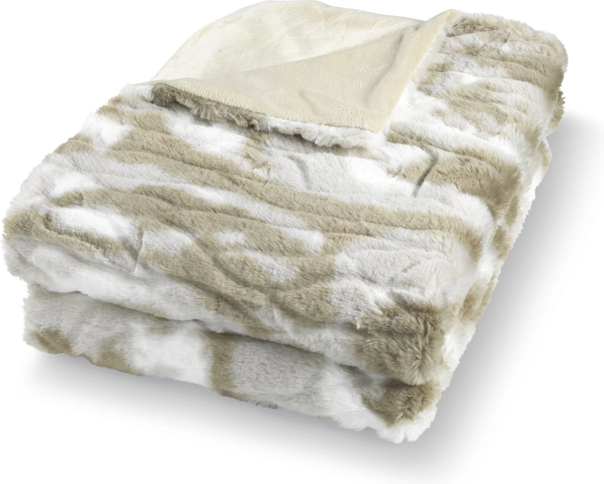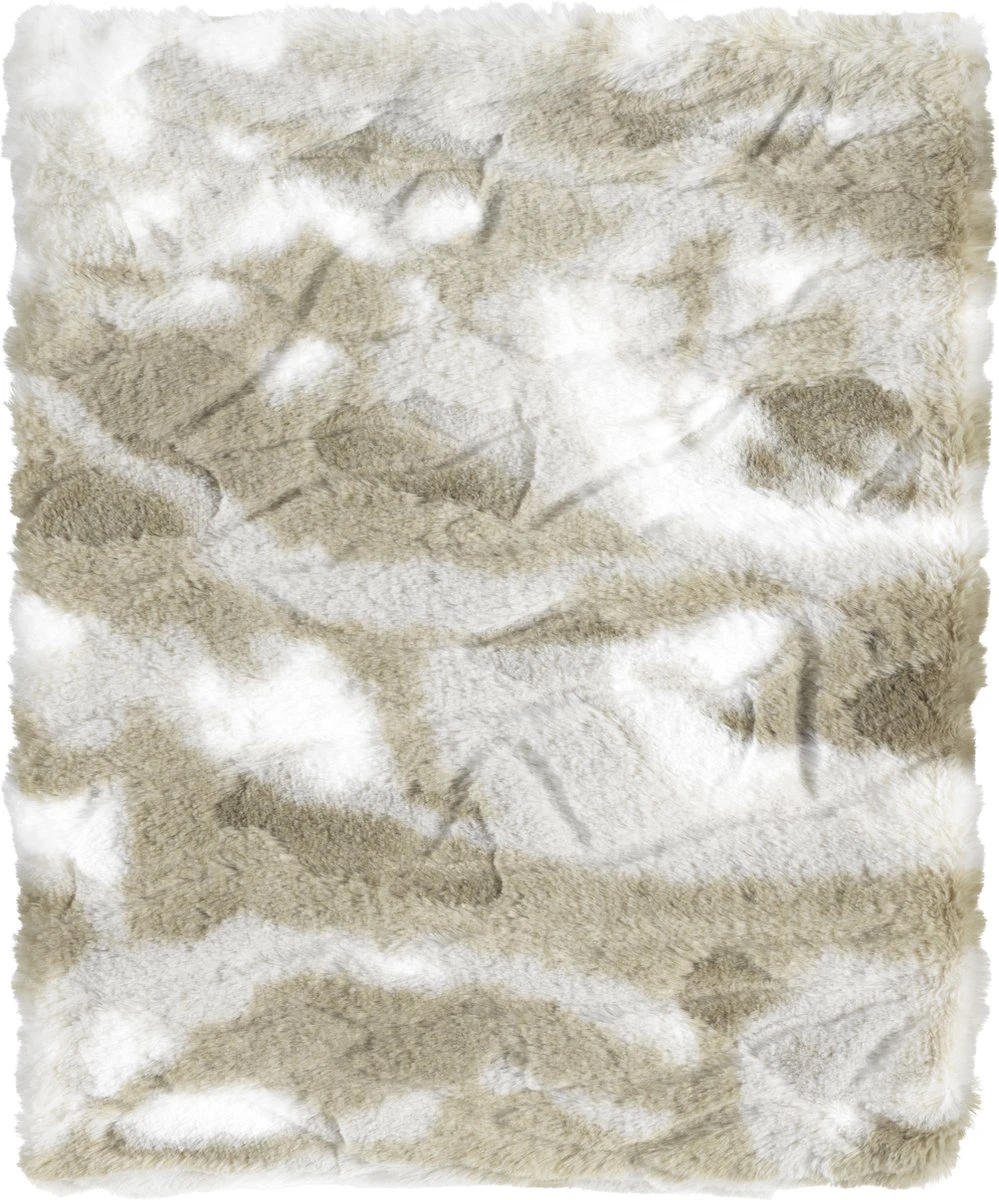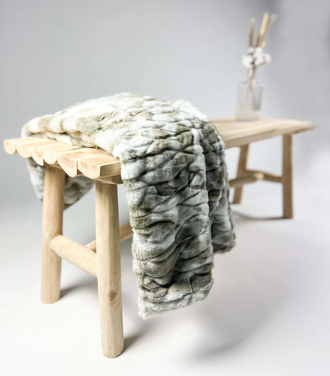 Superzacht en zwaar plaid met bontlook in de kleuren olijfgroen, beige en wit. Afmeting: 130×170 cm.