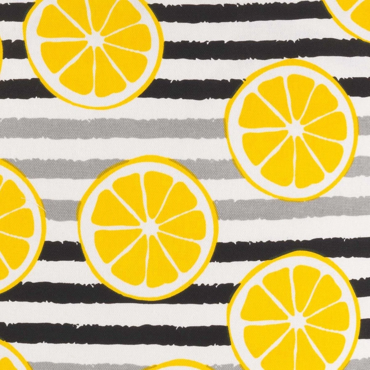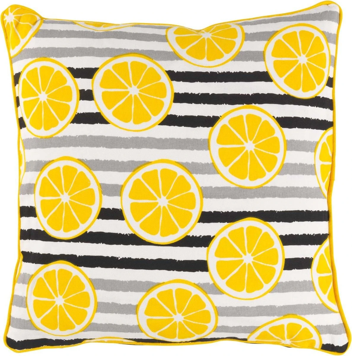 Sierkussen Julia met print van gele citroenen op een zwart wit gestreepte kussenhoes. Dit sierkussen wordt geleverd met een passend polyester vulkussen. Het sierkussen heeft een rits, zodat de hoes gemakkelijk van de kussenvulling kan worden afgehaald om te wassen. Sierkussen Julia is ook beschikbaar als losse kussenhoes zonder vulling.