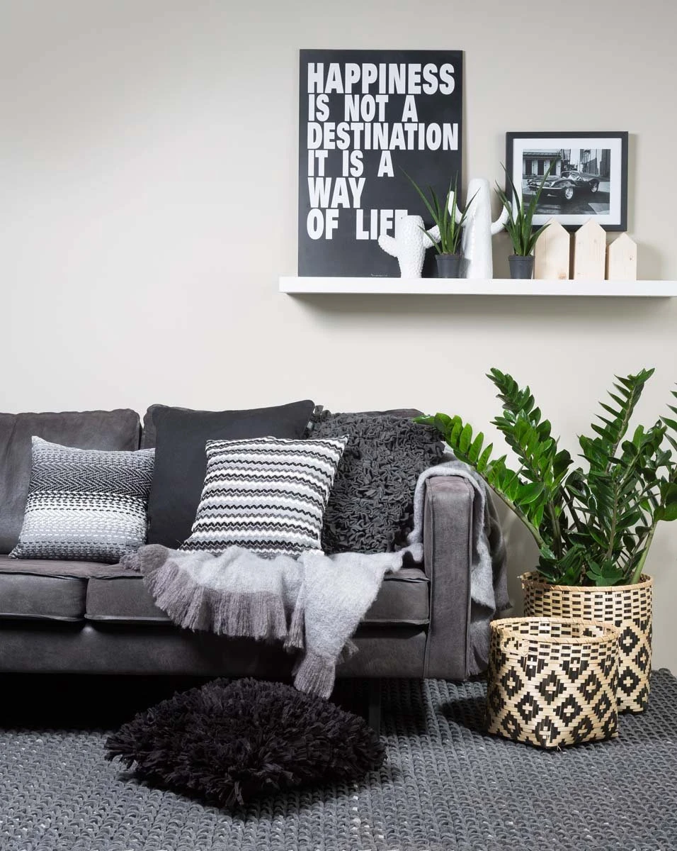 Kussenhoesje met geborduurd patroon in de kleuren zwart, wit en grijs. Kussenhoes Lena heeft een fijne rits aan de onderzijde en kan gemakkelijk gevuld worden met een standaard 45×45 cm vulkussen.