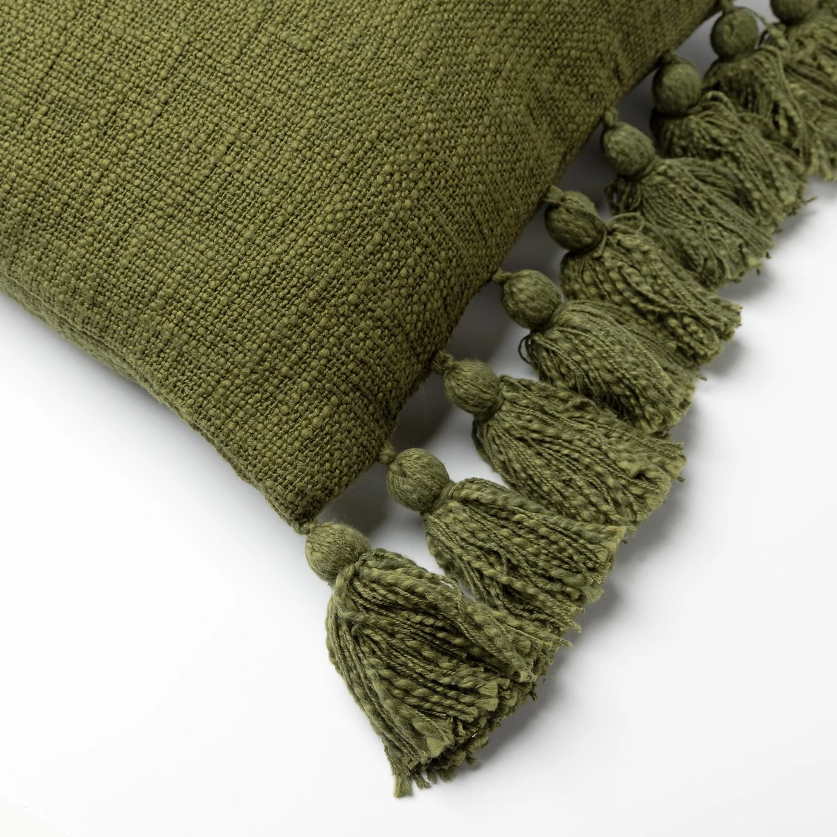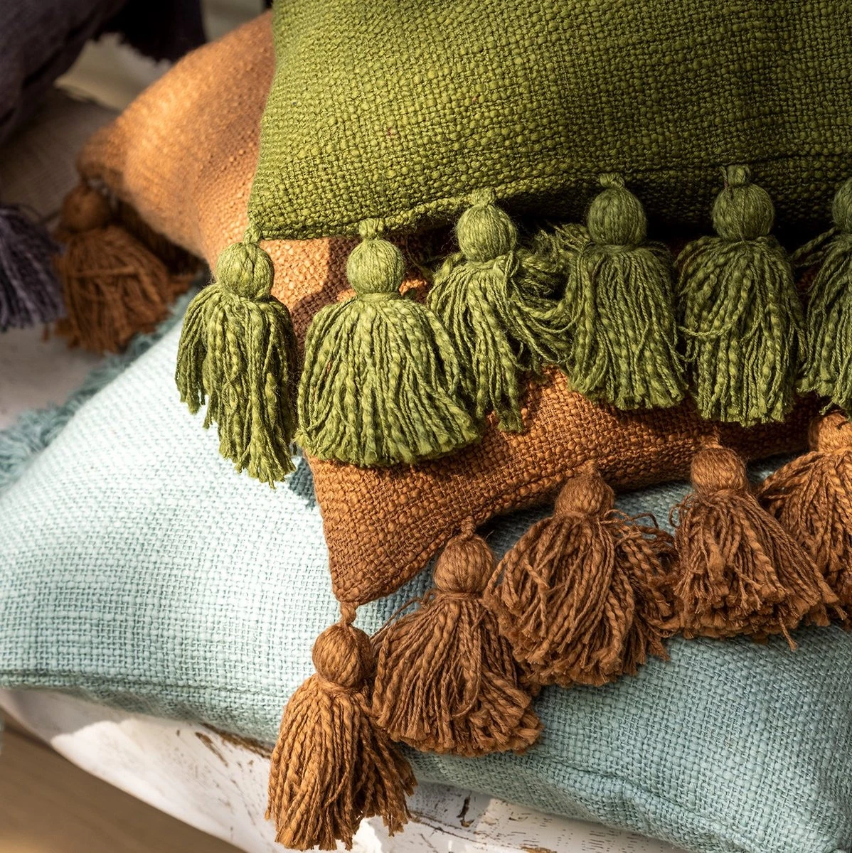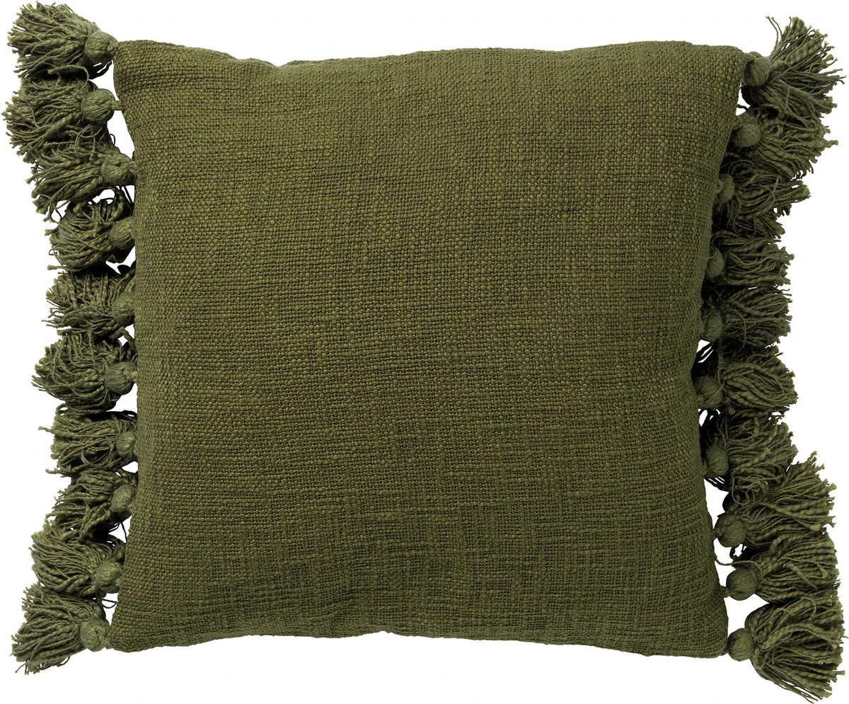Speels kussenhoesje van 100% katoen met kwastjes aan twee zijkanten. Kussenhoes Ruby heeft een afmeting van 45×45 cm en is in diverse kleuren leverbaar. De donkergroene katoenen stof van kussenhoes Ruby is grof geweven. Voorzien van een onopvallende rits aan de zijkant en kan gemakkelijk worden gevuld met een standaard 45×45 cm vulkussen. Pantone kleurtint: Chive