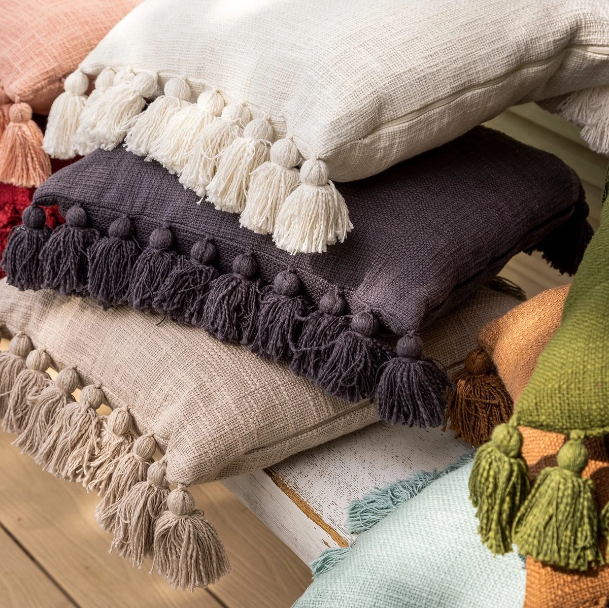 Speels kussenhoesje van 100% katoen met kwastjes aan twee zijkanten. Kussenhoes Ruby heeft een afmeting van 45×45 cm en is in diverse kleuren leverbaar. De zwarte katoenen stof van kussenhoes Ruby is grof geweven. Voorzien van een onopvallende rits aan de zijkant en kan gemakkelijk worden gevuld met een standaard 45×45 cm vulkussen. Pantone kleurtint: Raven